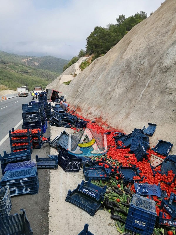 Kazada kamyonda maddi hasar meydana geldi, domates,salatalı ve patlıcanların bir bölümü ezildi.