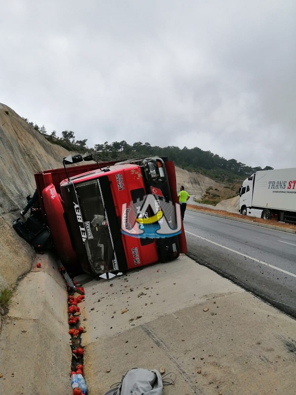 Anamur Melleç mevkiinde freni patlayan kamyon devrildi.