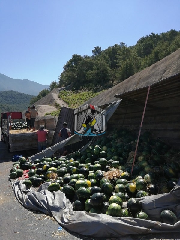 Anamur Melleç mevkiinde karpuz yüklü kamyon devrildi.