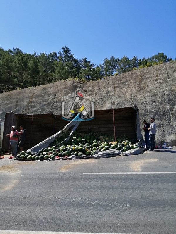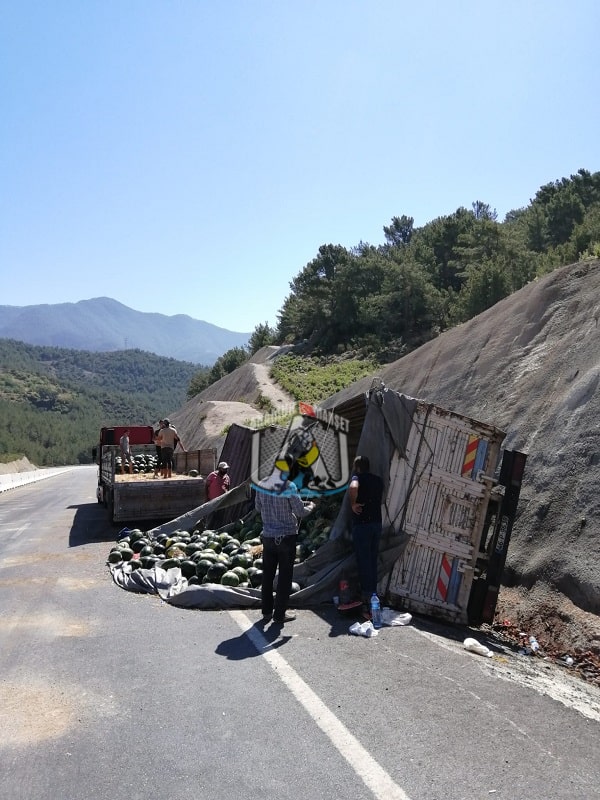 Edinilen bilgiye göre, Antalya yönünden Mersin yönüne gitmekte olan karpuz yüklü kamyonet, Melleç mevkiinde devrildi.Freni tutmayan kamyon devrilerek durabildi.Büyük bir şans eseri komyon sürücüsü yara almadan kurtuldu.