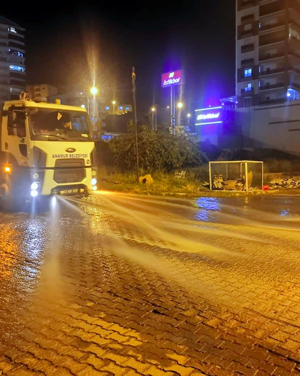 Son günlerde ülke genelinde hızla artış gösteren covid-19 salgınına karşı tedbirleri artıran Anamur Belediye Başkanlığı, sokağa çıkma kısıtlamasının saat 19'a çekilmesi ile birlikte kent genelinde hummalı bir temizlik çalışması başlattı.