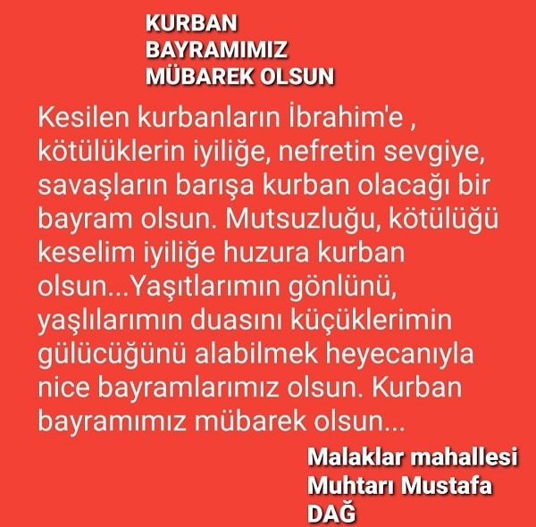 Malaklar Mahallesi Muhtarı Mustafa Dağ ; Bayramınız Kutlu Olsun
