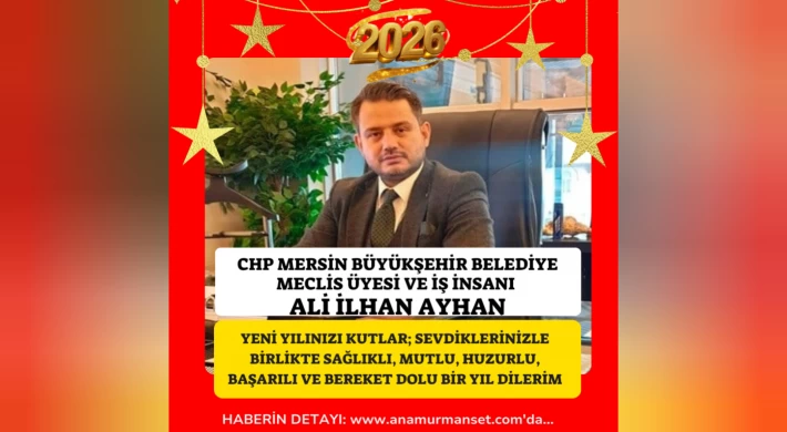 CHP Mersin Büyükşehir Belediye Meclis Üyesi ve iş insanı Ali İlhan Ayhan, yayımladığı Yeni Yıl mesajında birlik, dayanışma ve umut vurgusu yaparak 2026 yılının barış, sağlık ve refah getirmesini diledi.